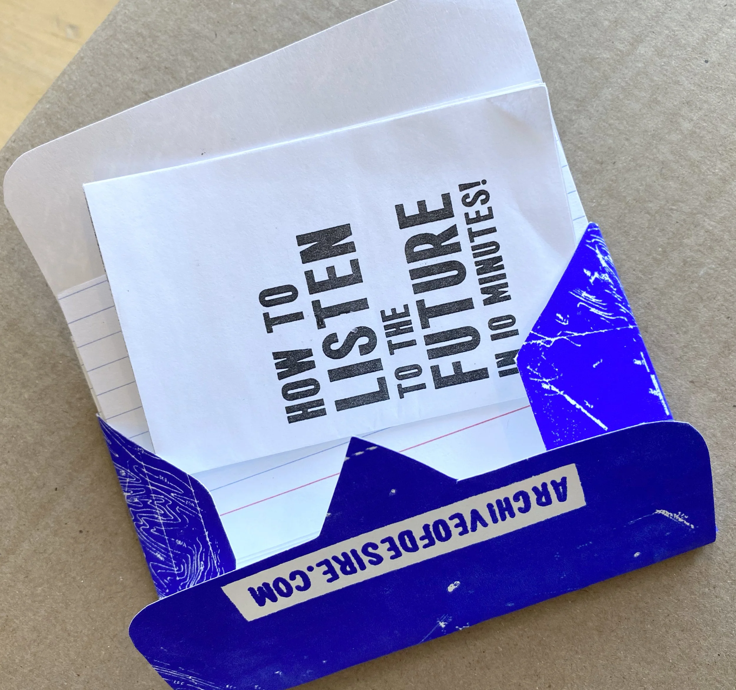 Left: Listen to the Future in 10 minutes kit with instructions and index cards for the archive, and a silkscreened cover in an edition of 200.